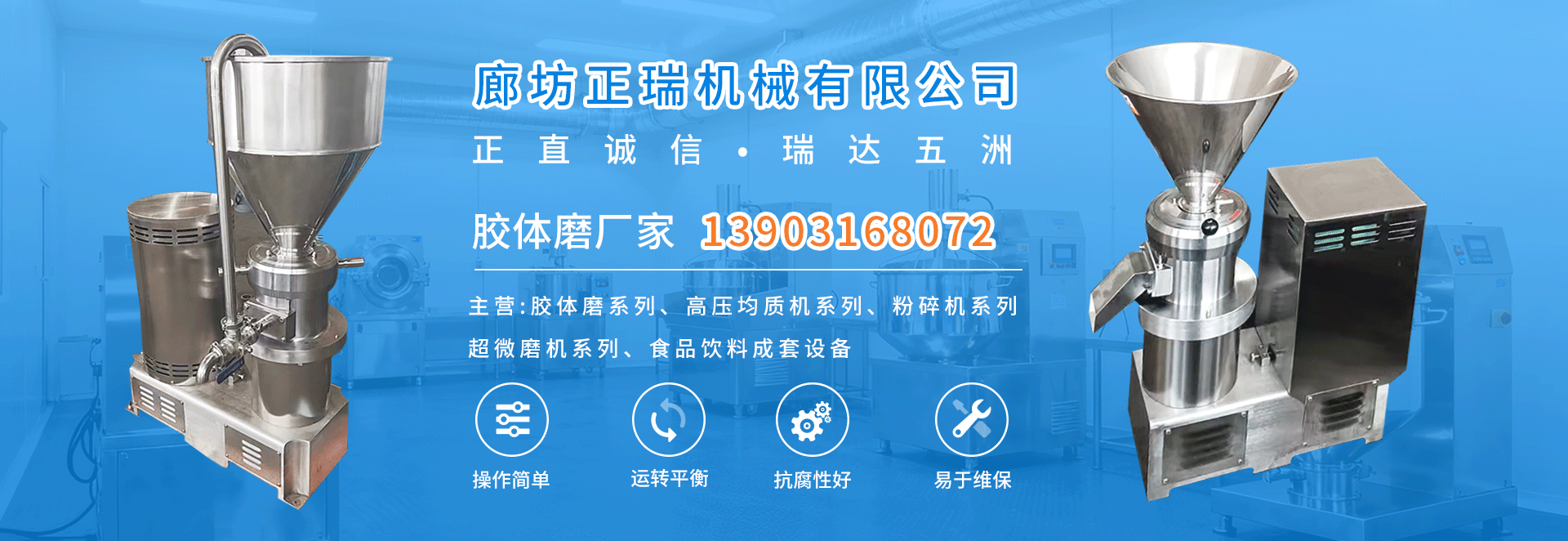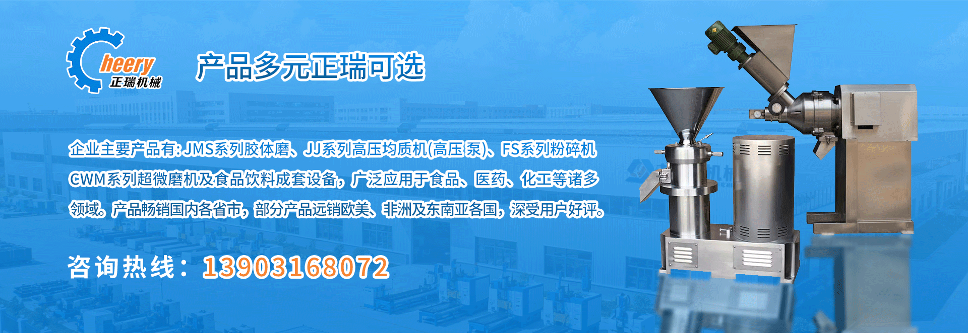 公司主要產品有JMS系列膠體磨、JJ系列高壓均質機、FS系列粉碎機、CWM系列超微磨機、PG破骨機系列以及食品飲料成套設備等。產品廣泛應用于食品、醫藥、化工等領域,暢銷國內并出口歐美、非洲、東南亞等國家,深受用戶好評。